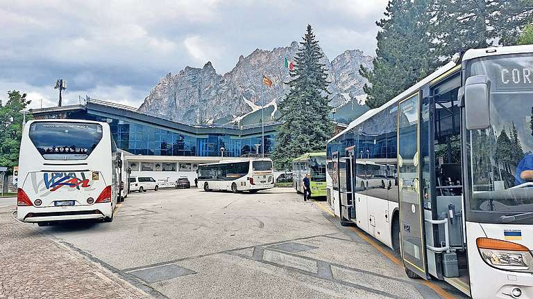 I pullman de linea, che i rua e i moe da Anpezo, ades i se ferma su ‘l piazal Atleti Azzurri d’Italia, daante a ‘l stadio Olimpico de ra jaza. Chi de el Comun de Anpezo i à abù da fei coscita, parcé che in stazion i à sarà duto el piazal, agnó che ades ‘l é el cantier par jaà e fabricà. Intrà dute chi servizie che i à abù da tramudà, ‘l é anche i poste par ra corieres. In stazion se fermaa chi de Dolomiti Bus, con tre poste; outre tre par Cortina Express; tre par Atvo; ‘l ea anche outre poste, par ra corieres de i turistes, che mena ca i foreste, pichesee da fora de r’Italia, che de spes i no dora i so automobiles.