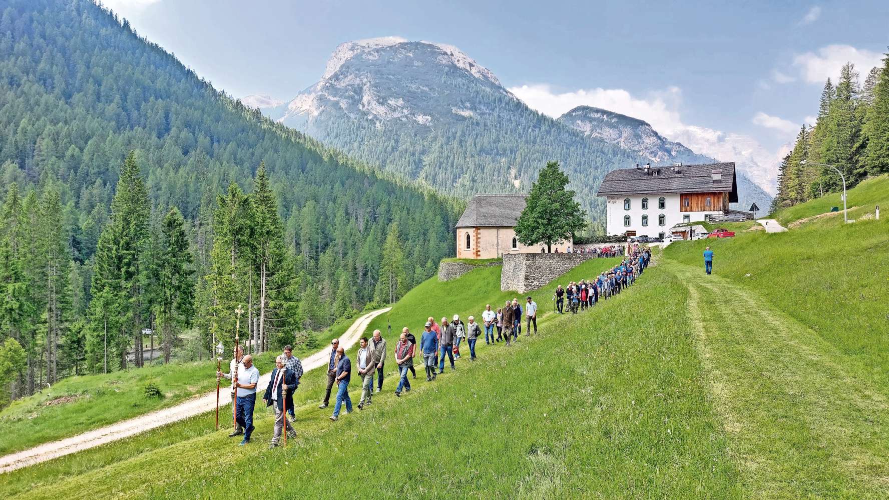 Un an 2026 de festes par ra vecia jeja de i sante Nicolò, Biajo e Tone abate, a ‘l Ospedà de Anpezo. Ra doa portiscios de ousciuda e d’outon, par preà el Signor e par i dì gramarzé ben