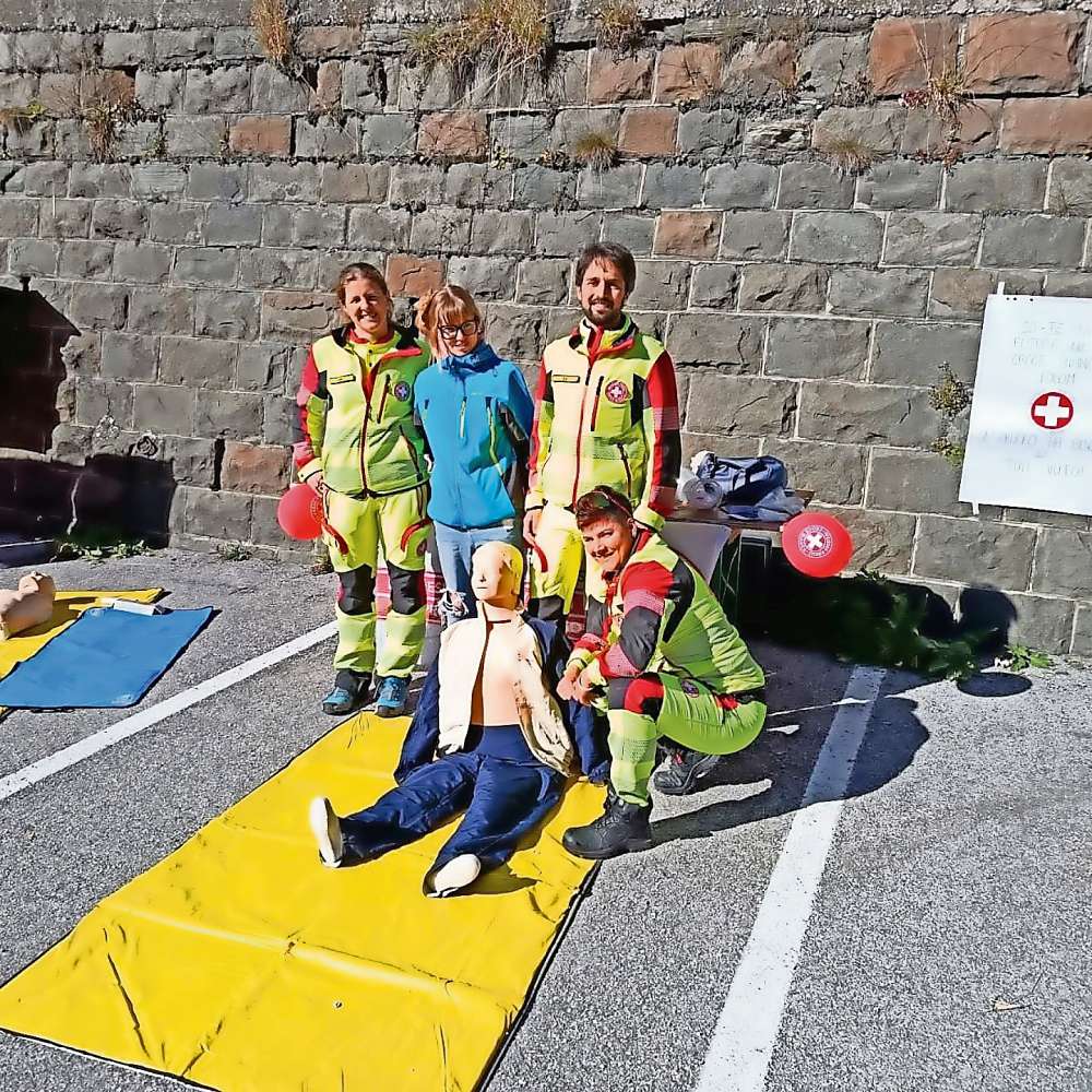 I volontari de la crousc Bláncia Fodom n plaza per la campagna de sensibilizazion su la rianimazion cardiopolmonar