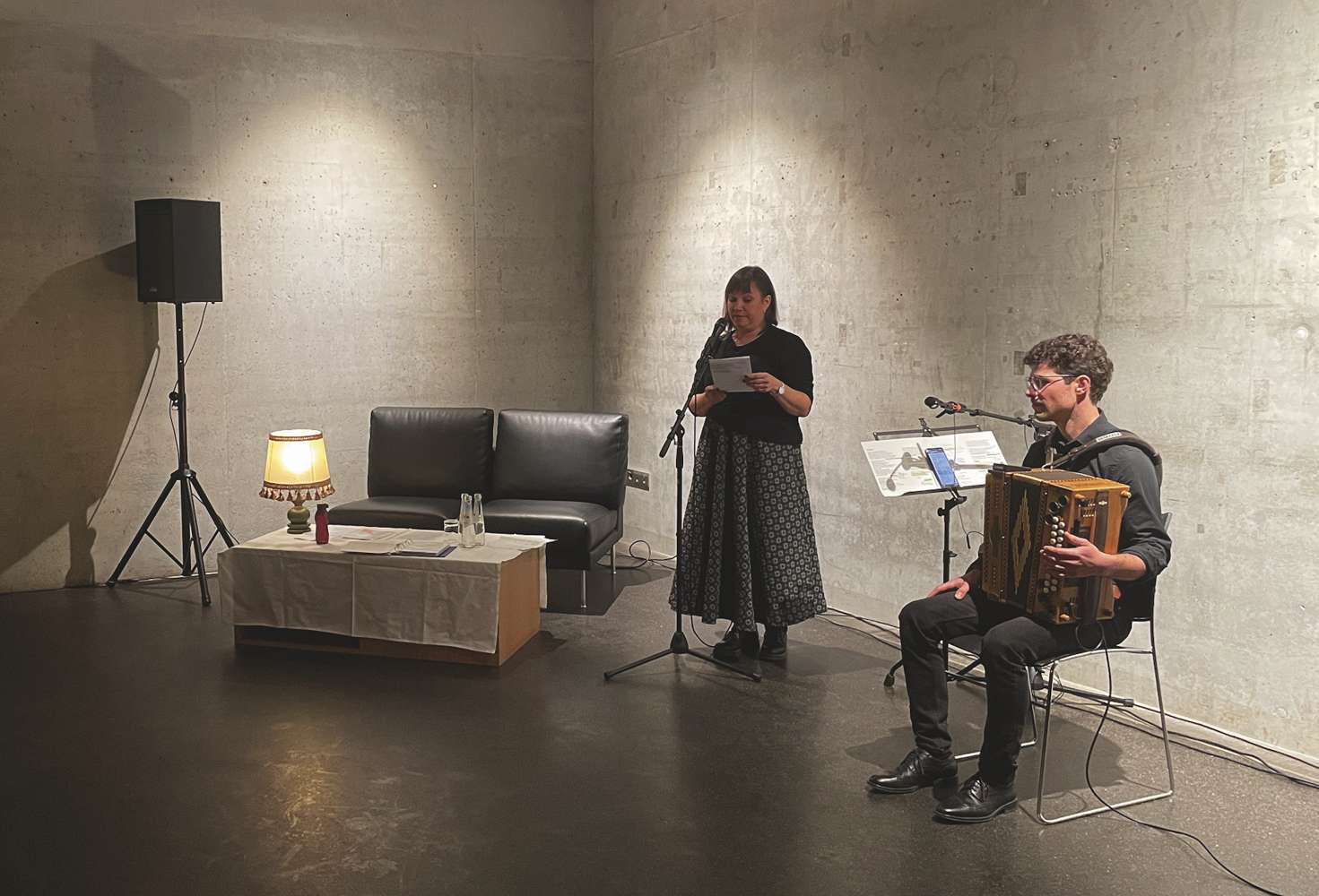 Do la prejentazion dl Calënder iesen jic inant cun la pert sun chëla che l publich se à ncunfertà: la artista de "poetry slam" Irene Moroder de Urtijëi à liet dant si tesć te trëi rujenedes - tudësch, talian y ladin - cumpanieda dala armonica de Mattia Demetz, nce ël de Urtijëi.