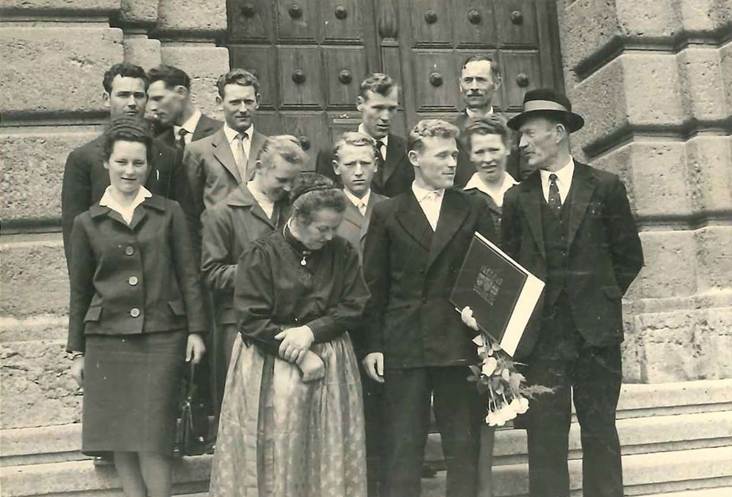 cern o balotes cun golasc. Le cëi ê sann, deache al gnô cujiné cun produc chersciüs sön le lüch, é pö La Pli n post soredlin; an â a La Pli de bona farina da cëi y da pan, soni, pavé, faus, arbëies y cotan de früc d’urt ne manciâ nia. Le vistimënt ê da paur fat cun drap de lana; sön les störes rovâl le sartú, le carigá, le tescere, le fomere; an se ponê sön strasoc, d’invern ê les ciamenes y i lec frëic desco na dlacia. Fonso é jü a scora fascista val’ agn y a chëra todëscia. Düc i scolars messâ, acompagná dai maestri, jí vigni de a mëssa; ma la "Jöbia fascista" n’êl degüna scora. I jüc che i scolars da laota fajô ê la pëia, la scogna, dala bona sajun frincené cun sciessores, d’invern se araité cun la liösa da Meghita cina jö Somür; i gragn la vagâ bëgn da jí jö por tlea y cina jö por taela. La gran pert di mituns messâ jí a sorví a mëssa. Al tëmp dl fascism ê i maestri blot taliagn, dal 1943 ennant êl scora todëscia y che insegnâ êl a La Pli Eduard Rungger d’Al Plan, Anna Campidel de Badia, Ida Castlunger da Rina, Fridl Mühlmann da La Pli, Olga Morlang da Predesot, Nane Elliscases da La Pli y Adele Delazer da Fodom. Religiun insegnâ la ploan Davide Ferdigg y i caplans Heinrich Videsott da Mantëna, Soave Costantini y Bruno Majoni da Ampëz, Angel Complojer da La Val. Fonso de Soratru ê dl 1941 jü ala Pröma Comuniun y confermé l’â le vësco Johannes Geissler. Fonso ê te süa classa un di mius y chisc gnô scialdi chiris fora dal prou por i mené a Porsenú a scora, cun la speranza che ai jiss do la matura tl Seminar.